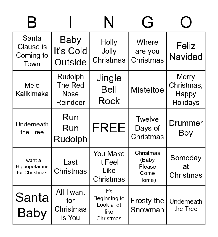 This bingo card has a free space and 24 words: Last Christmas, All I want for Christmas is You, Jingle Bell Rock, Santa Baby, Feliz Navidad, Santa Clause is Coming to Town, Mele Kalikimaka, Baby It's Cold Outside, Twelve Days of Christmas, You Make it Feel Like Christmas, Misteltoe, Underneath the Tree, Christmas (Baby Please Come Home), Someday at Christmas, Rudolph The Red Nose Reindeer, Frosty the Snowman, Drummer Boy, Holly Jolly Christmas, Merry Christmas, Happy Holidays, Run Run Rudolph, Underneath the Tree, I want a Hippopotamus for Christmas, Where are you Christmas and It's Beginning to Look a lot like Christmas.