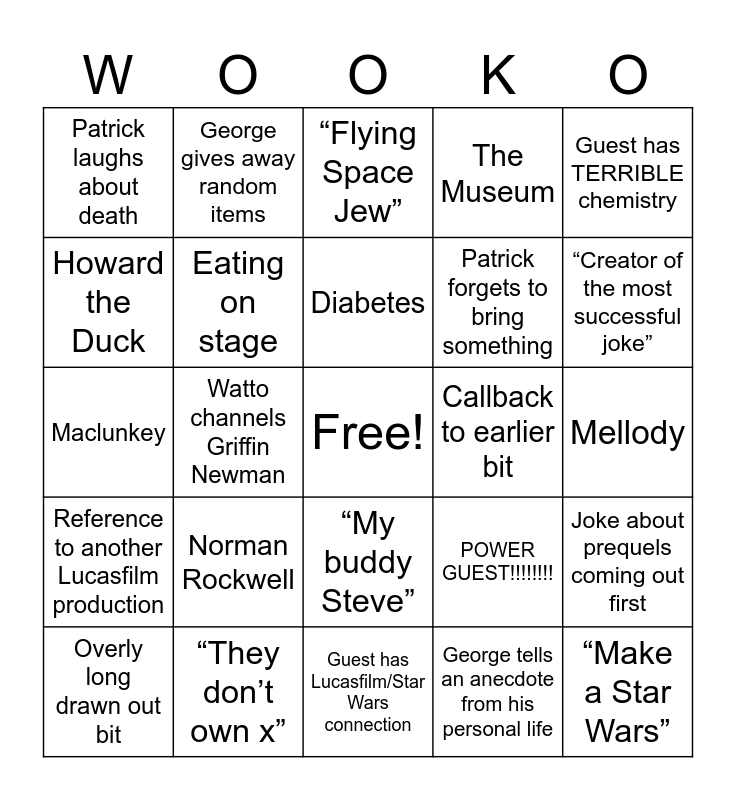 This bingo card has a free space and 44 words: Detours mention, “Make a Star Wars”, Patrick slander, Overly long drawn out bit, Butter Boy/Girl, George tells an anecdote from his personal life, “Flying Space Jew”, Guest has great chemistry, Guest has TERRIBLE chemistry, “They don’t own x”, The Museum, Callback to earlier bit, “My buddy Steve”, Norman Rockwell, Mention of George’s “loss”, Guest has Lucasfilm/Star Wars connection, George smashes something with a hammer, Maclunkey, Surprise guest, “Creator of the most successful joke”, George gives away random items, Butterbear speaks, Watto cup, Patrick laughs about death, Bad pun, Mellody, Priceless, Our Guests chant, POWER GUEST!!!!!!!!, Reference to another Lucasfilm production, Director’s Guild, Joke about prequels coming out first, Sucking face with Linda Ronstadt, Drinking on stage/stream, Watto channels Griffin Newman, Rough cut/test screening, Technical difficulty, Breaking into song, Diabetes, Howard the Duck, Patrick forgets to bring something, Guest hasn’t seen Star Wars, Eating on stage and Billionaire joke.