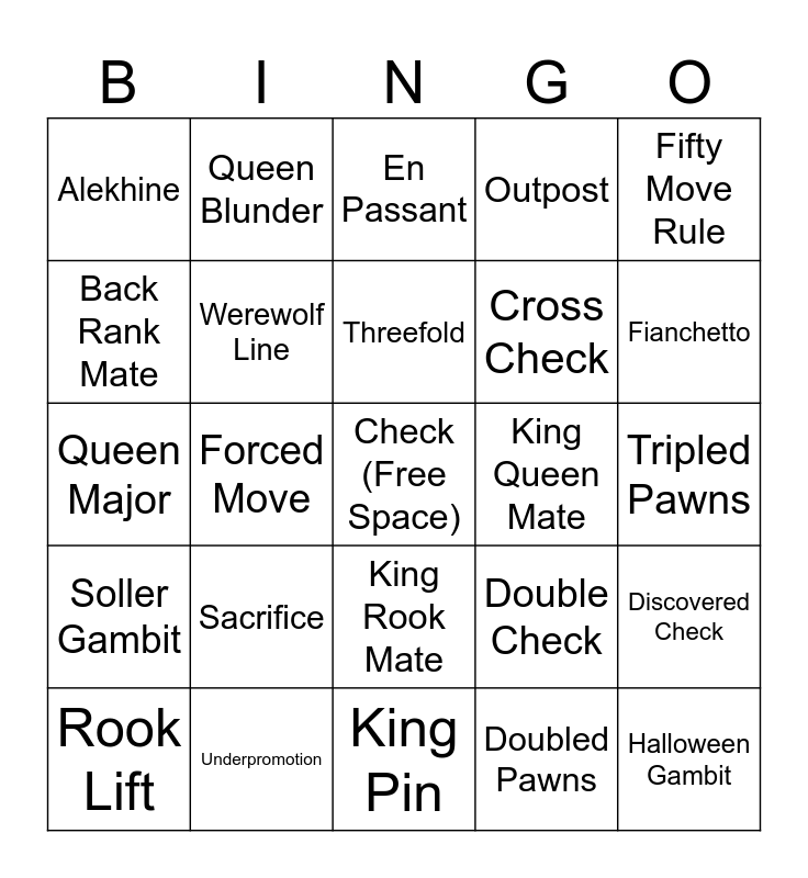 This bingo card has a free space and 24 words: Sacrifice, Underpromotion, Threefold, Rook Lift, Fifty Move Rule, Alekhine, Back Rank Mate, Queen Blunder, King Queen Mate, King Rook Mate, Cross Check, Queen Major, Double Check, Discovered Check, Werewolf Line, Doubled Pawns, Tripled Pawns, En Passant, Fianchetto, Forced Move, Halloween Gambit, Soller Gambit, Outpost and King Pin.