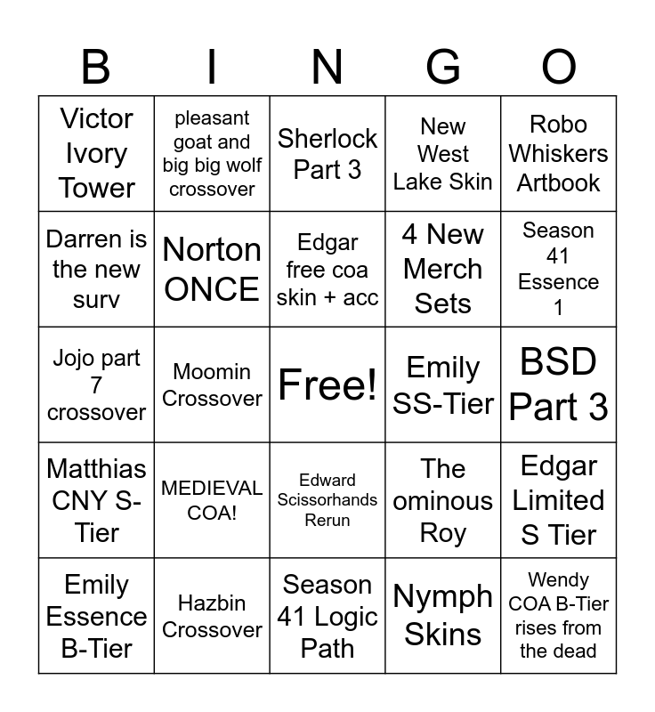 This bingo card has a free space and 24 words: MEDIEVAL COA!, Hazbin Crossover, Edgar free coa skin + acc, Emily Essence B-Tier, Robo Whiskers Artbook, Victor Ivory Tower, Darren is the new surv, pleasant goat and big big wolf crossover, Emily SS-Tier, Edward Scissorhands Rerun, 4 New Merch Sets, Jojo part 7 crossover, The ominous Roy, Edgar Limited S Tier, Norton ONCE, Nymph Skins, BSD Part 3, Sherlock Part 3, Season 41 Essence 1, Moomin Crossover, Wendy COA B-Tier rises from the dead, Matthias CNY S-Tier, New West Lake Skin and Season 41 Logic Path.