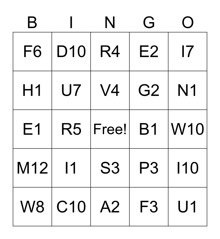 This bingo card has a free space and 29 words: W8, T9, R5, V3, F6, R4, U7, I1, B1, C10, W10, U1, A2, F3, N1, D2, S3, M12, I7, E1, P3, H6, G2, H1, E2, D10, I10, V4 and X3.