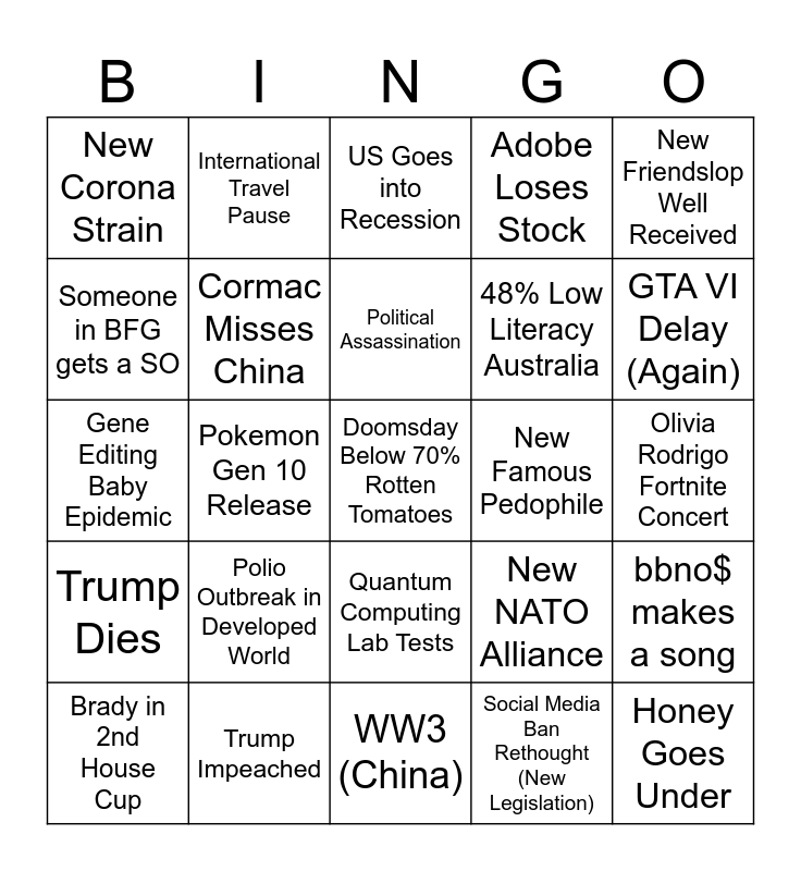 This bingo card has 25 words: Trump Dies, Trump Impeached, Doomsday Below 70% Rotten Tomatoes, Social Media Ban Rethought (New Legislation), New Friendslop Well Received, New Corona Strain, International Travel Pause, US Goes into Recession, New Famous Pedophile, bbno$ makes a song, Someone in BFG gets a SO, Cormac Misses China, WW3 (China), New NATO Alliance, GTA VI Delay (Again), Brady in 2nd House Cup, Pokemon Gen 10 Release, Political Assassination, 48% Low Literacy Australia, Olivia Rodrigo Fortnite Concert, Gene Editing Baby Epidemic, Polio Outbreak in Developed World, Quantum Computing Lab Tests, Adobe Loses Stock and Honey Goes Under.