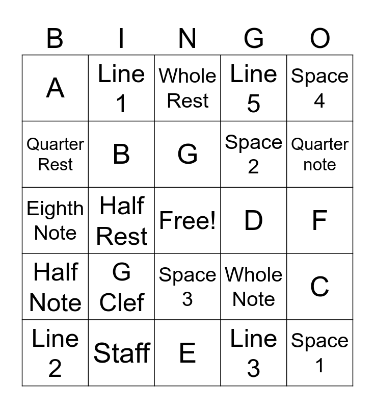 This bingo card has a free space and 24 words: G Clef, Staff, G, Line 2, Space 4, A, Quarter Rest, Line 1, D, Space 3, Space 2, Eighth Note, Whole Note, C, B, Line 3, F, Whole Rest, Quarter note, Half Rest, Space 1, Half Note, Line 5 and E.