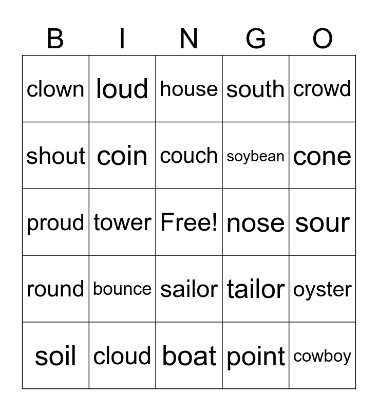 This bingo card has a free space and 24 words: bounce, cloud, couch, soil, crowd, clown, shout, loud, nose, sailor, soybean, proud, tailor, oyster, coin, point, sour, house, cone, tower, cowboy, round, south and boat.
