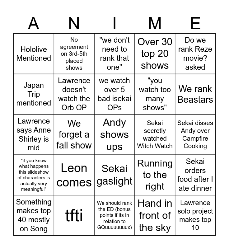 This bingo card has 32 words: Hand in front of the sky, Feather Motif, We forget a fall show, show no one watched makes top 10, "if you know what happens this slideshow of characters is actually very meaningful", Lawrence doesn't watch the Orb OP, Do we rank Reze movie? asked, Sekai orders food after I ate dinner, No agreement on 3rd-5th placed shows, Lawrence solo project makes top 10, we watch over 5 bad isekai OPs, "we don't need to rank that one", Witch Watch #1, we let me do regions instead of numbers, Sekai secretly watched Witch Watch, Someone besides me mentions ONAs, Something makes top 40 mostly on Song, Lawrence says Anne Shirley is mid, Sekai gaslight, Leon comes, Running to the right, Blue Box OP1 over OP2, Sekai disses Andy over Campfire Cooking, tfti, Andy shows ups, Over 30 top 20 shows, "you watch too many shows", Japan Trip mentioned, Hololive Mentioned, We should rank the ED (bonus points if its in relation to GQuuuuuuuux), Should be lower because Fantasy and We rank Beastars.