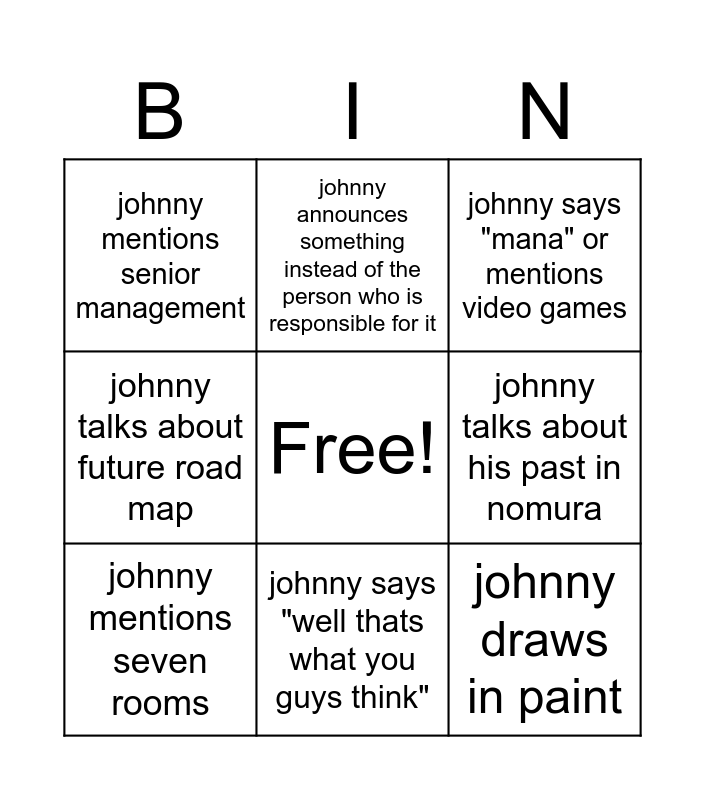 This bingo card has a free space and 12 words: johnny says a bad joke, johnny asks a question and nobody raises their hand to answer, johnny draws in paint, johnny talks about his past in nomura, johnny announces something instead of the person who is responsible for it, johnny says "mana" or mentions video games, johnny says "well thats what you guys think", johnny gushes about AI, johnny mentions senior management, johnny talks about future road map, johnny mentions seven rooms and johnny mentions hyatt or hilton.