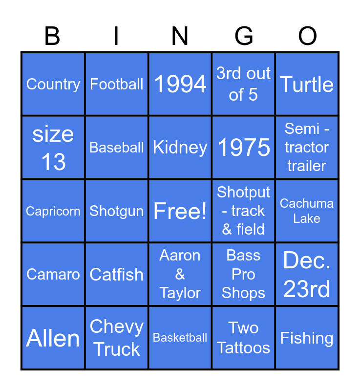 This bingo card has a free space and 24 words: Catfish, Chevy Truck, Kidney, Allen, Turtle, Country, size 13, Football, Shotput - track & field, Aaron & Taylor, 1975, Capricorn, Bass Pro Shops, Dec. 23rd, Baseball, Two Tattoos, Cachuma Lake, 1994, Semi - tractor trailer, Shotgun, Fishing, Camaro, 3rd out of 5 and Basketball.
