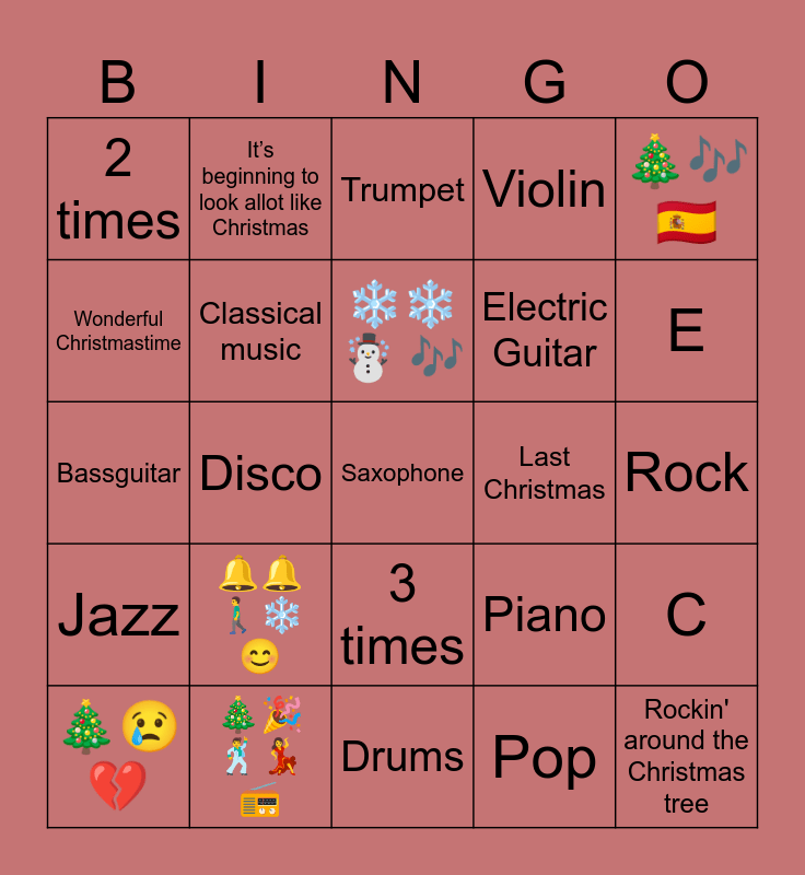 This bingo card has a free space and 24 words: πππΆββοΈβοΈ π, πππΊπ π», βοΈβοΈ βοΈ πΆ, ππ’ π, ππΆ πͺπΈ, 2 times, Wonderful Christmastime, Itβs beginning to look allot like Christmas, Last Christmas, 3 times, Electric Guitar, Bassguitar, Piano, C, Classical music, Pop, Rock, Trumpet, E, Disco, Rockin' around the Christmas tree, Jazz, Violin and Drums.