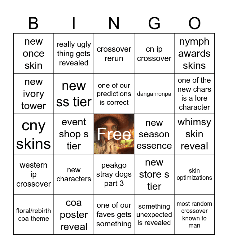 This bingo card has a free space and 24 words: new characters, coa poster reveal, one of our predictions is correct, floral/rebirth coa theme, nymph awards skins, new once skin, new ivory tower, really ugly thing gets revealed, new season essence, peakgo stray dogs part 3, danganronpa, cny skins, new store s tier, skin optimizations, new ss tier, something unexpected is revealed, whimsy skin reveal, crossover rerun, one of the new chars is a lore character, event shop s tier, most random crossover known to man, western ip crossover, cn ip crossover and one of our faves gets something.