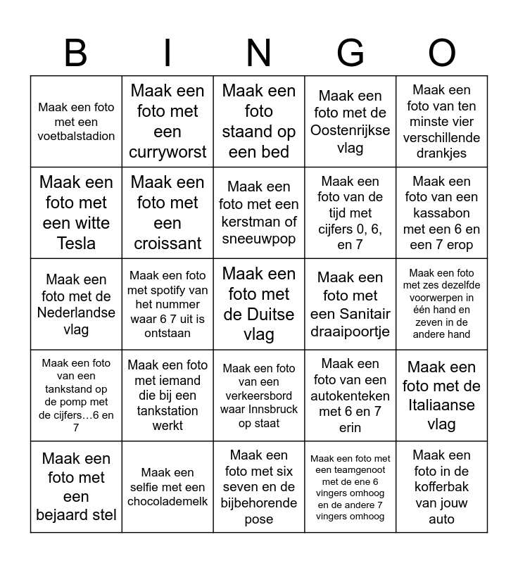 This bingo card has 25 words: Maak een foto met iemand die bij een tankstation werkt, Maak een foto met six seven en de bijbehorende pose, Maak een foto met een kerstman of sneeuwpop, Maak een foto met een bejaard stel, Maak een foto van ten minste vier verschillende drankjes, Maak een foto met een voetbalstadion, Maak een foto met een witte Tesla, Maak een foto met een curryworst, Maak een foto met een Sanitair draaipoortje, Maak een foto van een verkeersbord waar Innsbruck op staat, Maak een foto van de tijd met cijfers 0, 6, en 7, Maak een foto met de Nederlandse vlag, Maak een foto van een autokenteken met 6 en 7 erin, Maak een foto met de Italiaanse vlag, Maak een foto met een croissant, Maak een foto in de kofferbak van jouw auto, Maak een foto met zes dezelfde voorwerpen in één hand en zeven in de andere hand, Maak een foto staand op een bed, Maak een foto van een kassabon met een 6 en een 7 erop, Maak een foto met spotify van het nummer waar 6 7 uit is ontstaan, Maak een foto met de Duitse vlag, Maak een selfie met een chocolademelk, Maak een foto van een tankstand op de pomp met de cijfers…6 en 7, Maak een foto met de Oostenrijkse vlag and Maak een foto met een teamgenoot met de ene 6 vingers omhoog en de andere 7 vingers omhoog.
