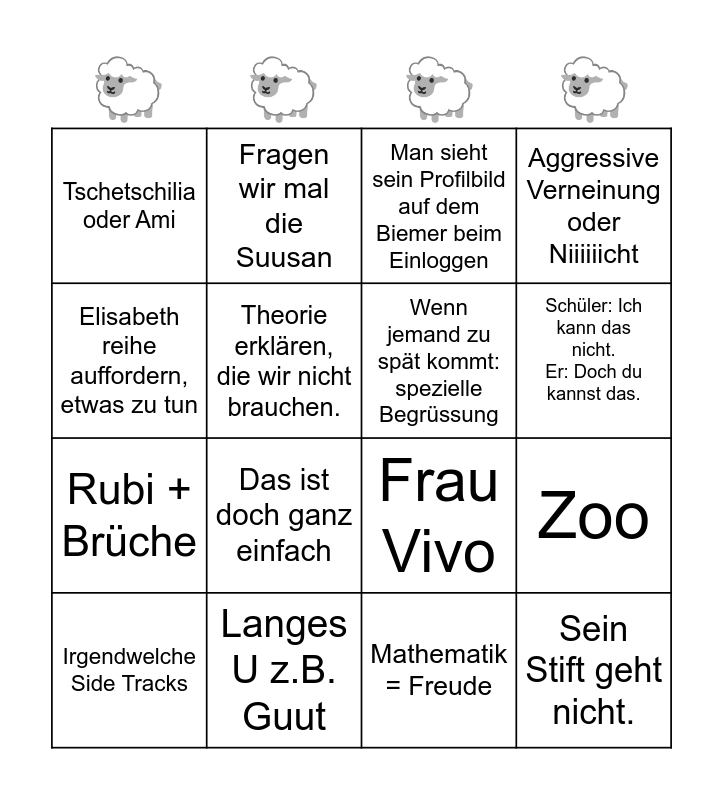 This bingo card has 16 words: Langes U z.B. Guut, Zoo, Man sieht sein Profilbild auf dem Biemer beim Einloggen, Tschetschilia oder Ami, Rubi + Brรผche, Fragen wir mal die Suusan, Frau Vivo, Mathematik = Freude, Elisabeth reihe auffordern, etwas zu tun, Theorie erklรคren, die wir nicht brauchen., Irgendwelche Side Tracks, Aggressive Verneinung oder Niiiiiicht, Das ist doch ganz einfach, Schรผler: Ich kann das nicht. Er: Doch du kannst das., Wenn jemand zu spรคt kommt: spezielle Begrรผssung and Sein Stift geht nicht..