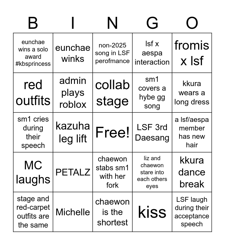 This bingo card has a free space and 24 words: PETALZ, Michelle, collab stage, stage and red-carpet outfits are the same, fromis x lsf, eunchae wins a solo award #kbsprincess, red outfits, eunchae winks, LSF 3rd Daesang, chaewon stabs sm1 with her fork, sm1 covers a hybe gg song, sm1 cries during their speech, liz and chaewon stare into each others eyes, kkura dance break, admin plays roblox, kiss, a lsf/aespa member has new hair, non-2025 song in LSF perofmance, kkura wears a long dress, kazuha leg lift, LSF laugh during their acceptance speech, MC laughs, lsf x aespa interaction and chaewon is the shortest.