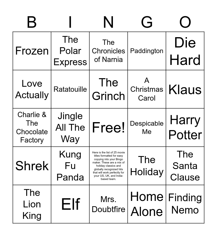 This bingo card has a free space and 26 words: Here is the list of 25 movie titles formatted for easy copying into your Bingo maker. These are a mix of holiday classics and globally recognized hits that will work perfectly for your US, UK, and India-based team., Home Alone, The Grinch, Elf, Die Hard, Frozen, Love Actually, The Polar Express, Harry Potter, The Holiday, A Christmas Carol, Charlie & The Chocolate Factory, The Santa Clause, The Lion King, Jingle All The Way, The Muppet Christmas Carol, Paddington, Shrek, The Chronicles of Narnia, Finding Nemo, Klaus, Mrs. Doubtfire, Despicable Me, Kung Fu Panda, Ratatouille and Toy Story.