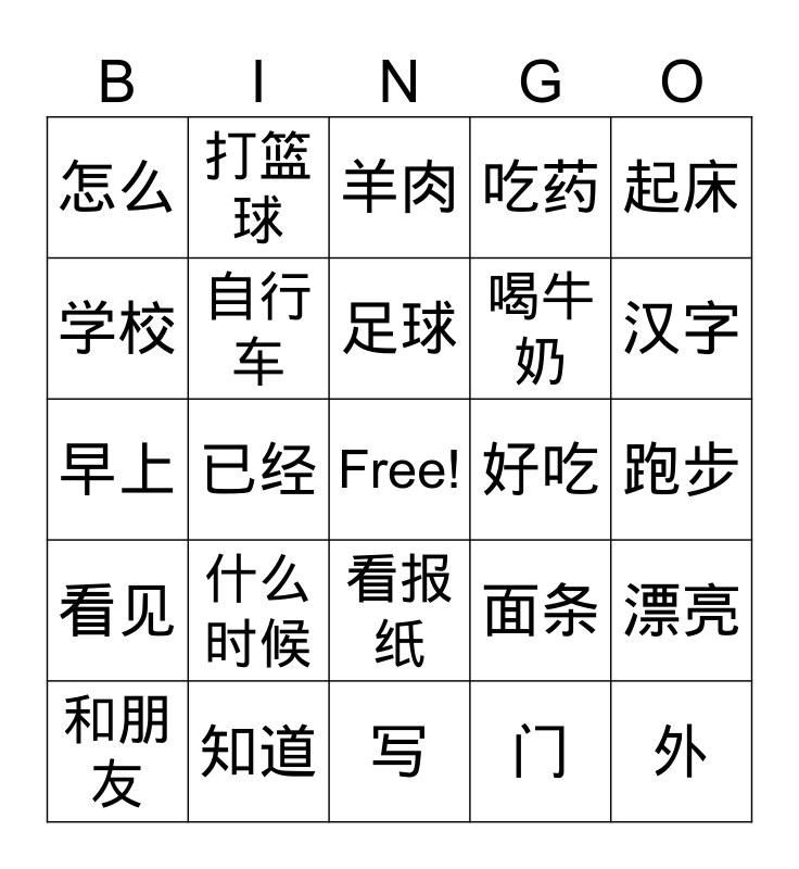 This bingo card has a free space and 24 words: 什么时候, 知道, 足球, 和朋友, 起床, 怎么, 学校, 打篮球, 好吃, 看报纸, 喝牛奶, 早上, 面条, 漂亮, 自行车, 门, 跑步, 羊肉, 汉字, 已经, 外, 看见, 吃药 and 写.