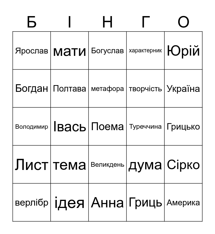 This bingo card has a free space and 24 words: тема, ідея, метафора, верлібр, Юрій, Ярослав, Богдан, мати, Туреччина, Великдень, творчість, Володимир, дума, Сірко, Полтава, Гриць, Грицько, Богуслав, Україна, Івась, Америка, Лист, характерник and Анна.