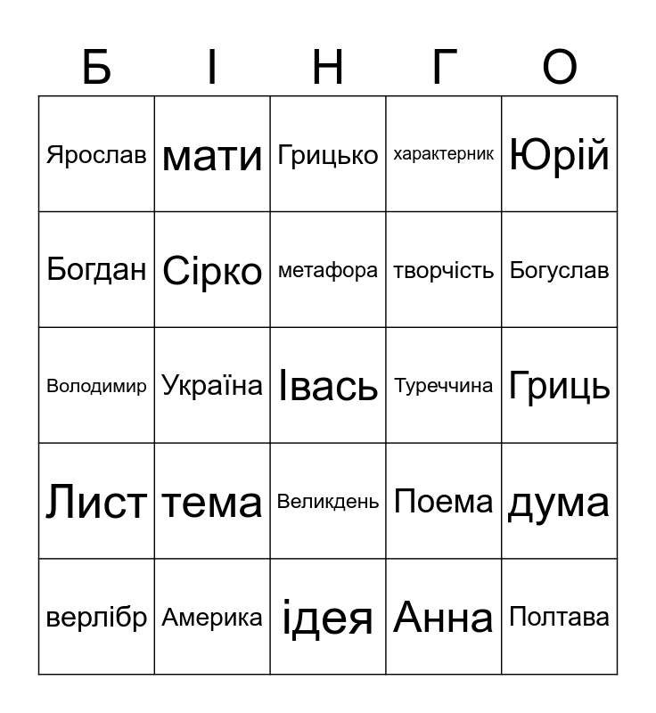 This bingo card has 25 words: тема, ідея, метафора, верлібр, Юрій, Ярослав, Богдан, мати, Туреччина, Великдень, творчість, Володимир, Поема, дума, Сірко, Полтава, Гриць, Грицько, Богуслав, Україна, Івась, Америка, Лист, характерник and Анна.