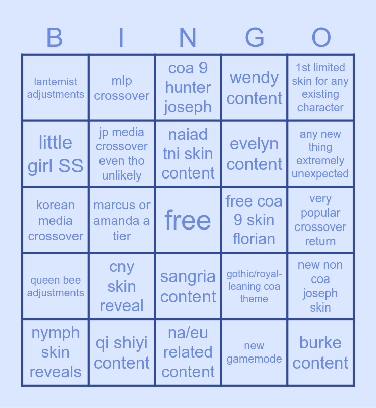 This bingo card has a free space and 24 words: cny skin reveal, qi shiyi content, naiad tni skin content, nymph skin reveals, 1st limited skin for any existing character, lanternist adjustments, little girl SS, mlp crossover, free coa 9 skin florian, sangria content, evelyn content, korean media crossover, gothic/royal-leaning coa theme, new non coa joseph skin, jp media crossover even tho unlikely, new gamemode, very popular crossover return, coa 9 hunter joseph, any new thing extremely unexpected, marcus or amanda a tier, burke content, queen bee adjustments, wendy content and na/eu related content.