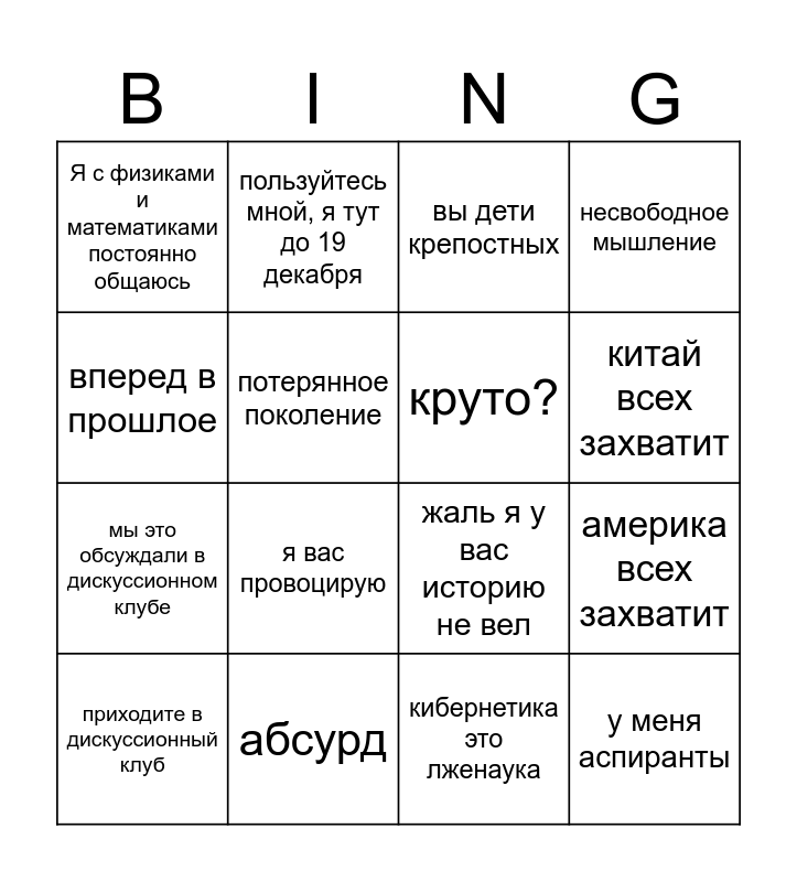This bingo card has 16 words: абсурд, америка всех захватит, вы дети крепостных, Я с физиками и математиками постоянно общаюсь, мы это обсуждали в дискуссионном клубе, пользуйтесь мной, я тут до 19 декабря, жаль я у вас историю не вел, кибернетика это лженаука, вперед в прошлое, потерянное поколение, приходите в дискуссионный клуб, несвободное мышление, я вас провоцирую, китай всех захватит, круто? and у меня аспиранты.