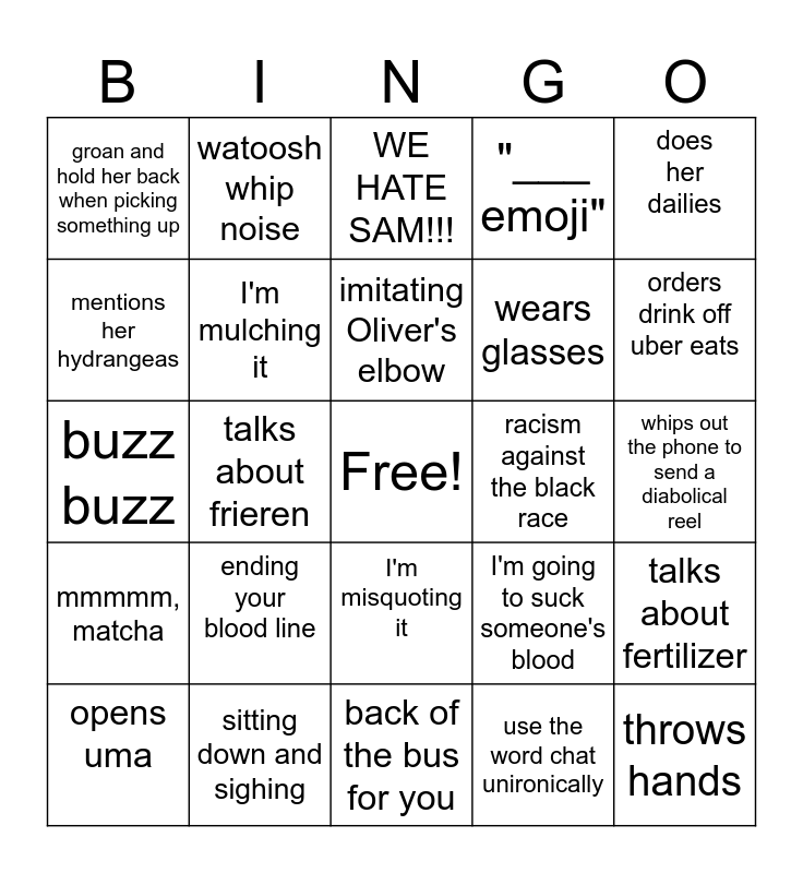 This bingo card has a free space and 24 words: ending your blood line, sitting down and sighing, imitating Oliver's elbow, opens uma, does her dailies, groan and hold her back when picking something up, mentions her hydrangeas, watoosh whip noise, racism against the black race, I'm misquoting it, wears glasses, buzz buzz, I'm going to suck someone's blood, talks about fertilizer, I'm mulching it, use the word chat unironically, whips out the phone to send a diabolical reel, WE HATE SAM!!!, orders drink off uber eats, talks about frieren, throws hands, mmmmm, matcha, "___ emoji" and back of the bus for you.