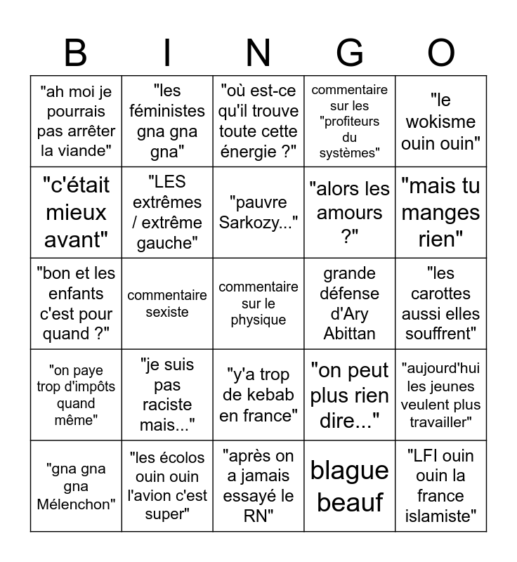 This bingo card has 25 words: "je suis pas raciste mais...", "après on a jamais essayé le RN", "pauvre Sarkozy...", "gna gna gna Mélenchon", "le wokisme ouin ouin", "ah moi je pourrais pas arrêter la viande", "c'était mieux avant", "les féministes gna gna gna", grande défense d'Ary Abittan, "y'a trop de kebab en france", "alors les amours ?", "bon et les enfants c'est pour quand ?", "on peut plus rien dire...", "aujourd'hui les jeunes veulent plus travailler", "LES extrêmes / extrême gauche", "LFI ouin ouin la france islamiste", "les carottes aussi elles souffrent", "où est-ce qu'il trouve toute cette énergie ?", "mais tu manges rien", commentaire sexiste, commentaire sur le physique, "les écolos ouin ouin l'avion c'est super", "on paye trop d'impôts quand même", commentaire sur les "profiteurs du systèmes" and blague beauf.