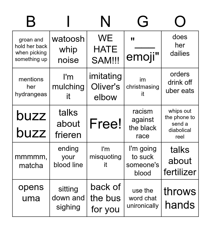 This bingo card has a free space and 24 words: ending your blood line, sitting down and sighing, imitating Oliver's elbow, opens uma, does her dailies, groan and hold her back when picking something up, mentions her hydrangeas, watoosh whip noise, racism against the black race, I'm misquoting it, im christmasing it, buzz buzz, I'm going to suck someone's blood, talks about fertilizer, I'm mulching it, use the word chat unironically, whips out the phone to send a diabolical reel, WE HATE SAM!!!, orders drink off uber eats, talks about frieren, throws hands, mmmmm, matcha, "___ emoji" and back of the bus for you.
