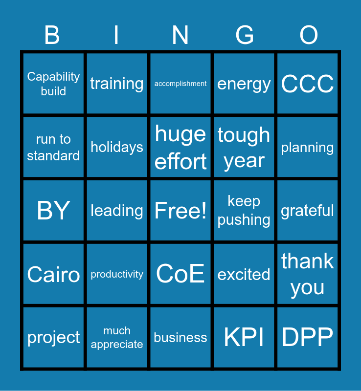 This bingo card has a free space and 24 words: productivity, much appreciate, huge effort, project, CCC, Capability build, run to standard, training, keep pushing, CoE, tough year, BY, excited, thank you, holidays, KPI, grateful, accomplishment, planning, leading, DPP, Cairo, energy and business.
