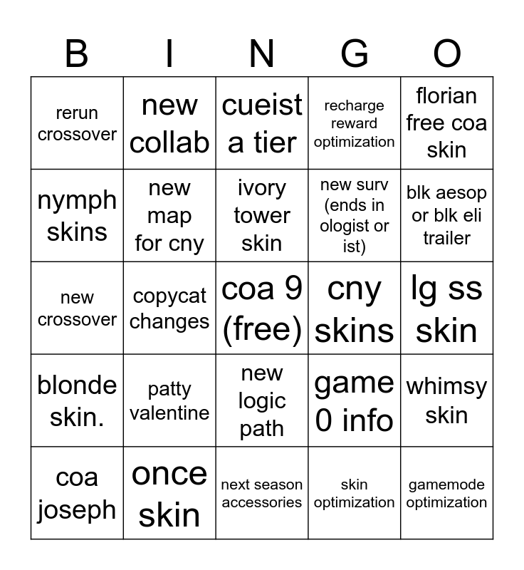This bingo card has a free space and 24 words: patty valentine, once skin, ivory tower skin, coa joseph, florian free coa skin, rerun crossover, nymph skins, new collab, cny skins, new logic path, new surv (ends in ologist or ist), new crossover, game 0 info, whimsy skin, new map for cny, skin optimization, lg ss skin, cueist a tier, blk aesop or blk eli trailer, copycat changes, gamemode optimization, blonde skin., recharge reward optimization and next season accessories.