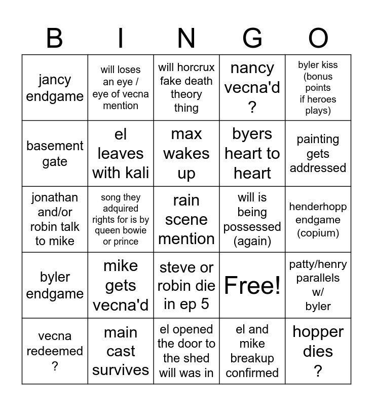 This bingo card has 25 words: mike gets vecna'd, el opened the door to the shed will was in, max wakes up, vecna redeemed ?, byler kiss (bonus points if heroes plays), jancy endgame, basement gate, will loses an eye / eye of vecna mention, will is being possessed (again), steve or robin die in ep 5, byers heart to heart, jonathan and/or robin talk to mike, Free!, patty/henry parallels w/ byler, el leaves with kali, hopper dies ?, henderhopp endgame (copium), will horcrux fake death theory thing, painting gets addressed, song they adquired rights for is by queen bowie or prince, rain scene mention, main cast survives, byler endgame, nancy vecna'd ? and el and mike breakup confirmed.