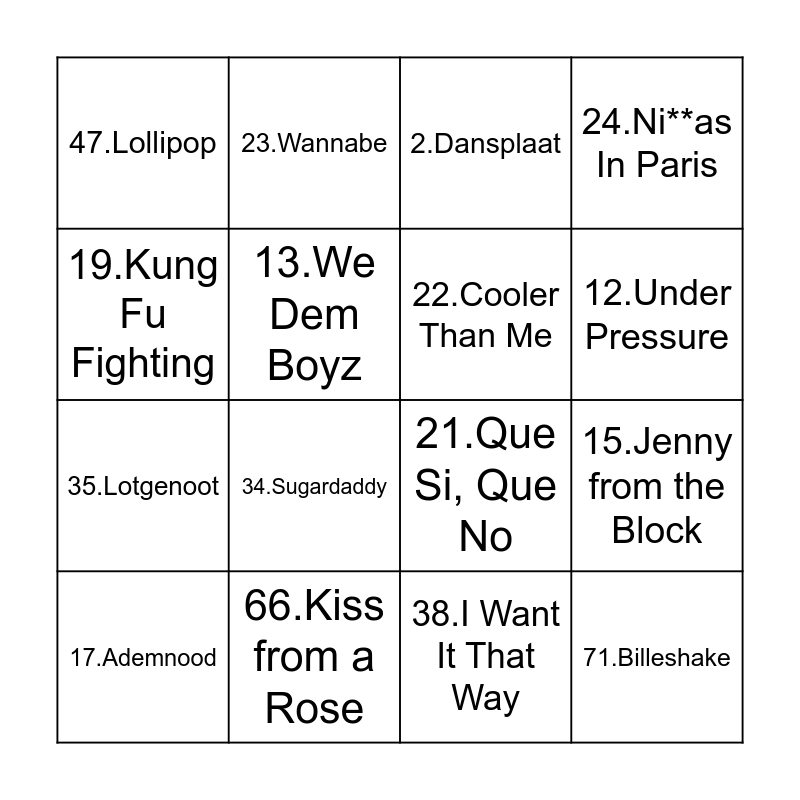 This bingo card has 1 images and 75 words: 1.Watskeburt?!, 2.Dansplaat, 3.MattaMan, 4.Ice Ice Baby, 5.California Love, 6.Casanova, 7.Have You Ever Been Mellow, 8.Freestyler, 9.Goede Tijden, Slechte Tijden, 10.Pokémon Theme, 11.Tikitak Tikitak, 12.Under Pressure, 13.We Dem Boyz, 14.Get Busy, 15.Jenny from the Block, 16.All I Want for Christmas Is You, 17.Ademnood, 18.You'll Never Walk Alone, 19.Kung Fu Fighting, 20.Pump Up The Jam, 21.Que Si, Que No, 22.Cooler Than Me, 23.Wannabe, 24.Ni**as In Paris, 25.The Ketchup Song, 26.Hollaback Girl, 27.Believe, 28.Last Christmas, 29.Driving Home for Christmas, 30.Holly Jolly Christmas, 31.Feliz Navidad, 32.It's All Coming Back to Me Now, 33.Lotje, 34.Sugardaddy, 35.Lotgenoot, 36.Be My Lover, 37.Mamma Mia, 38.I Want It That Way, 39.U Can't Touch This, 40.Dromen Zijn Bedrog, 41.Fireball, 42.Fireflies, 43....Baby One More Time, 44.Don't Stop Believin', 45.A Thousand Miles, 46.We Like To Party!, 47.Lollipop, 48.Party Up, 49.Drank & Drugs, 50.Right Round, 51.One More Time, 52.It's Beginning to Look a Lot Like Christmas, 53.Cheerleader, 54.Day 'N' Nite, 55.Boasty, 56.Whatta Man, 57.Crazy In Love, 58.Yeah!, 59.Low, 60.Hey Sexy Lady, 61.Last Christmas, 62.Tomatenplukkers, 63.Fantasy, 64.Terug In De Tijd, 65.Kiss, 66.Kiss from a Rose, 67.Everywhere, 68.Baila de Gasolina, 69.No Limit, 70.Candy Shop, 71.Billeshake, 72.Gasolina, 73.4x Duurder, 74.King Without a Crown and 75.Coño.