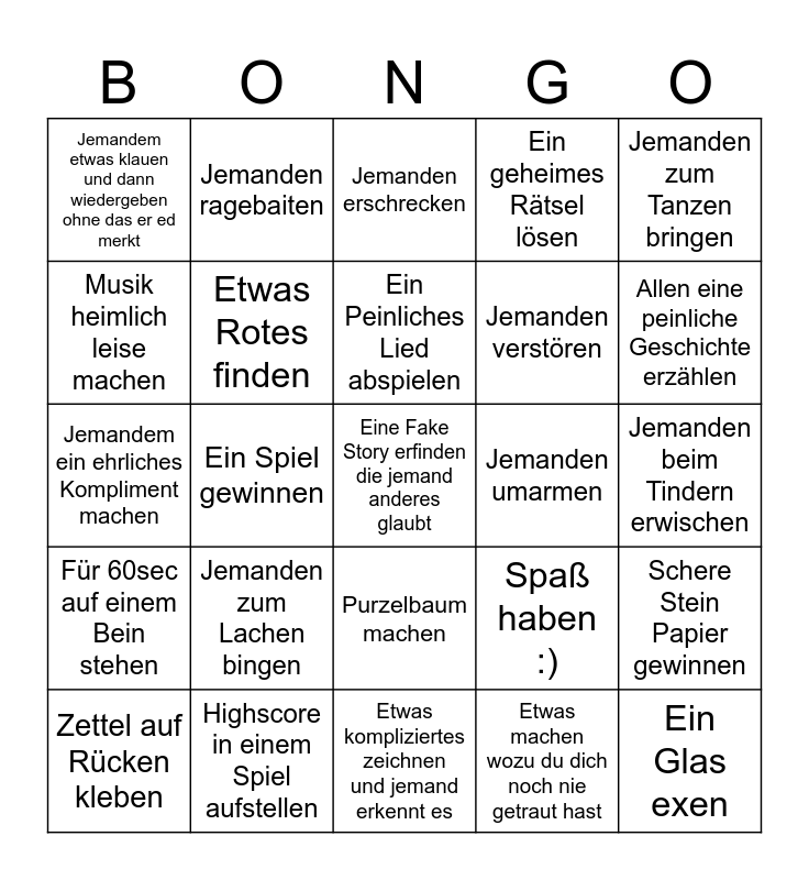 This bingo card has 25 words: Jemanden zum Lachen bingen, Etwas kompliziertes zeichnen und jemand erkennt es, Ein Peinliches Lied abspielen, Zettel auf Rücken kleben, Jemanden zum Tanzen bringen, Jemandem etwas klauen und dann wiedergeben ohne das er ed merkt, Musik heimlich leise machen, Jemanden ragebaiten, Jemanden umarmen, Purzelbaum machen, Jemanden verstören, Jemandem ein ehrliches Kompliment machen, Spaß haben :), Schere Stein Papier gewinnen, Etwas Rotes finden, Ein Glas exen, Jemanden beim Tindern erwischen, Jemanden erschrecken, Allen eine peinliche Geschichte erzählen, Ein Spiel gewinnen, Eine Fake Story erfinden die jemand anderes glaubt, Highscore in einem Spiel aufstellen, Für 60sec auf einem Bein stehen, Ein geheimes Rätsel lösen and Etwas machen wozu du dich noch nie getraut hast.