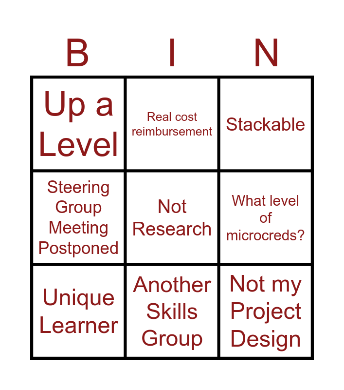 This bingo card has a free space and 8 words: What level of microcreds?, Stackable, Real cost reimbursement, Unique Learner, Up a Level, Not my Project Design, Steering Group Meeting Postponed and Another Skills Group.