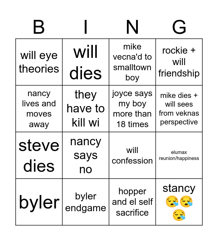 This bingo card has 16 words: byler, byler endgame, mike vecna'd to smalltown boy, rockie + will friendship, nancy lives and moves away, will dies, will confession, elumax reunion/happiness, will eye theories, they have to kill wi, hopper and el self sacrifice, mike dies + will sees from veknas perspective, steve dies, nancy says no, joyce says my boy more than 18 times and stancy 😪😪😪.
