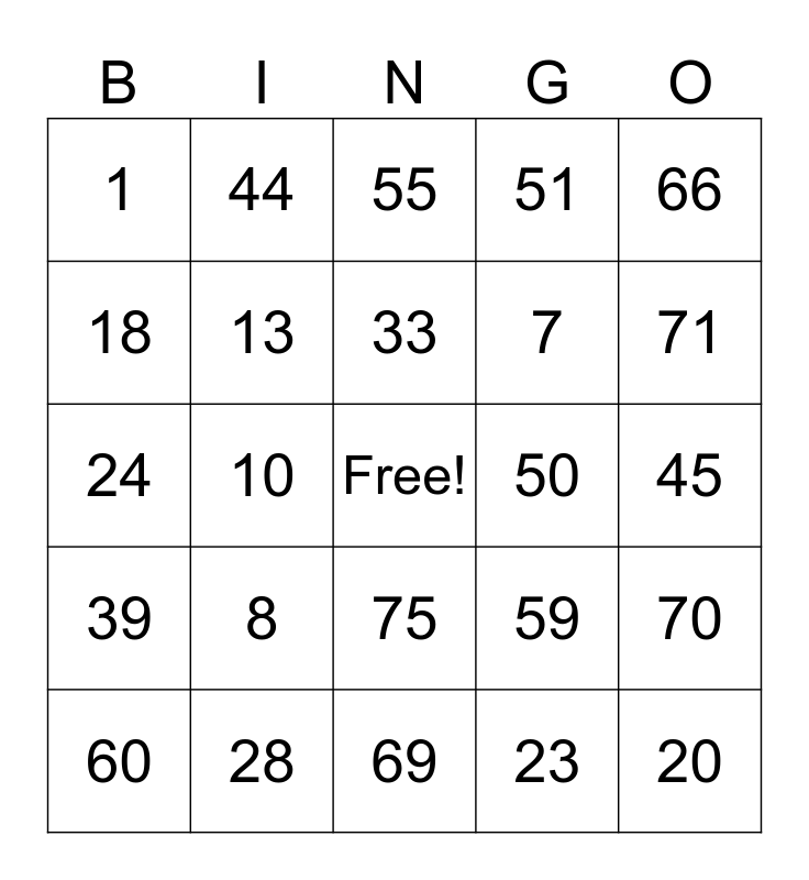 This bingo card has a free space and 24 words: 8, 28, 33, 60, 66, 1, 18, 44, 50, 75, 7, 24, 59, 70, 13, 23, 45, 55, 71, 10, 20, 39, 51 and 69.