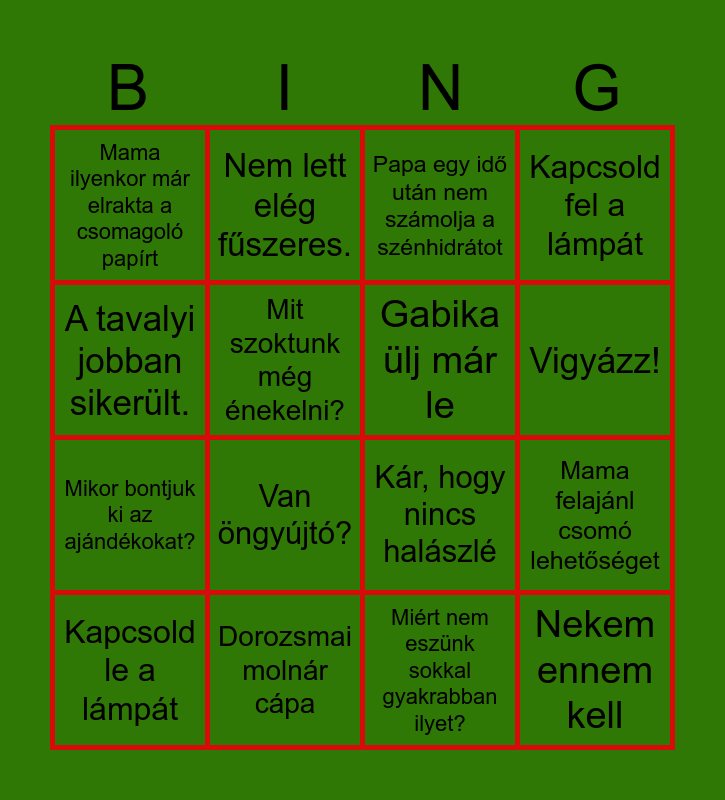 This bingo card has 16 words: Dorozsmai molnár cápa, Mama felajánl csomó lehetőséget, Papa egy idő után nem számolja a szénhidrátot, Mama ilyenkor már elrakta a csomagoló papírt, Mikor bontjuk ki az ajándékokat?, Nem lett elég fűszeres., Kár, hogy nincs halászlé, Miért nem eszünk sokkal gyakrabban ilyet?, A tavalyi jobban sikerült., Mit szoktunk még énekelni?, Kapcsold le a lámpát, Kapcsold fel a lámpát, Van öngyújtó?, Vigyázz!, Gabika ülj már le and Nekem ennem kell.