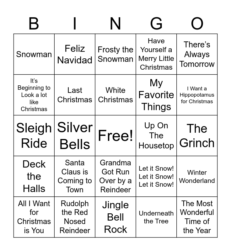 This bingo card has a free space and 27 words: Let it Snow! Let it Snow! Let it Snow!, Santa Tell Me, My Favorite Things, Jingle Bell Rock, It’s Beginning to Look a lot like Christmas, Frosty the Snowman, Feliz Navidad, Deck the Halls, Up On The Housetop, Winter Wonderland, Sleigh Ride, Have Yourself a Merry Little Christmas, All I Want for Christmas is You, Rudolph the Red Nosed Reindeer, I Want a Hippopotamus for Christmas, Little Drummer Boy, Last Christmas, White Christmas, Santa Claus is Coming to Town, Snowman, The Grinch, Underneath the Tree, Silver Bells, The Most Wonderful Time of the Year, Grandma Got Run Over by a Reindeer, There’s Always Tomorrow and I Have a Little Dreidel.