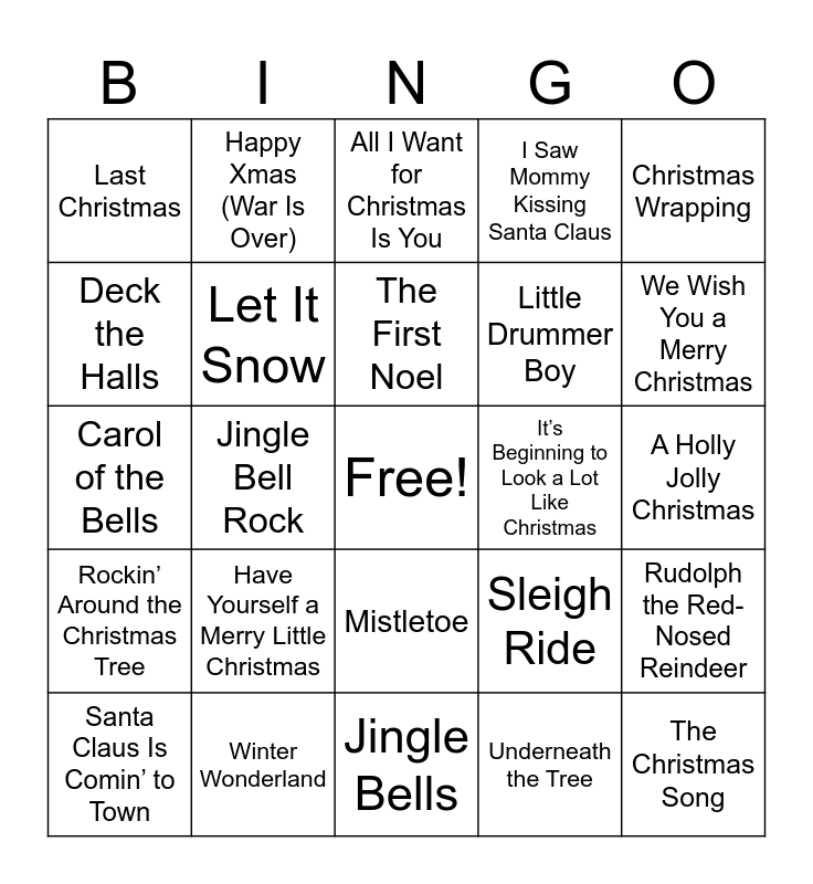 This bingo card has a free space and 32 words: Underneath the Tree, White Christmas, Jingle Bell Rock, Mary, Did You Know?, Rockin’ Around the Christmas Tree, Let It Snow, Christmas Wrapping, Rudolph the Red-Nosed Reindeer, Happy Xmas (War Is Over), Feliz Navidad, The First Noel, All I Want for Christmas Is You, Silent Night, Grandma Got Run Over by a Reindeer, It’s Beginning to Look a Lot Like Christmas, Blue Christmas, Santa Claus Is Comin’ to Town, Carol of the Bells, Mistletoe, Have Yourself a Merry Little Christmas, Sleigh Ride, Do They Know It’s Christmas?, A Holly Jolly Christmas, Winter Wonderland, The Christmas Song, I Saw Mommy Kissing Santa Claus, Little Drummer Boy, Deck the Halls, Last Christmas, Jingle Bells, O Holy Night and We Wish You a Merry Christmas.