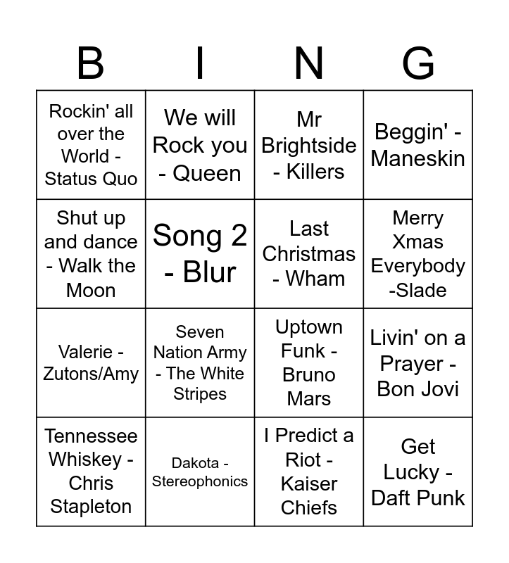 This bingo card has 16 words: Dakota - Stereophonics, Livin' on a Prayer - Bon Jovi, Mr Brightside - Killers, Rockin' all over the World - Status Quo, Valerie - Zutons/Amy, We will Rock you - Queen, Uptown Funk - Bruno Mars, I Predict a Riot - Kaiser Chiefs, Shut up and dance - Walk the Moon, Song 2 - Blur, Tennessee Whiskey - Chris Stapleton, Beggin' - Maneskin, Seven Nation Army - The White Stripes, Merry Xmas Everybody -Slade, Last Christmas - Wham and Get Lucky - Daft Punk.