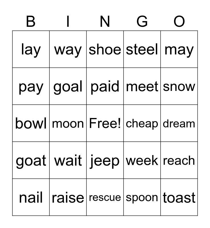 This bingo card has a free space and 24 words: wait, raise, paid, nail, may, lay, pay, way, cheap, jeep, meet, bowl, week, reach, goal, spoon, dream, shoe, snow, moon, toast, goat, steel and rescue.