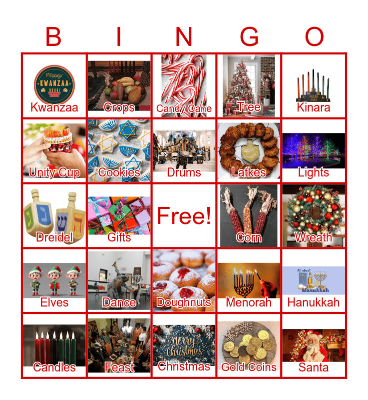This bingo card has 24 images, a free space and 24 words: Dance, Feast, Drums, Candles, Kinara, Kwanzaa, Unity Cup, Crops, Corn, Doughnuts, Latkes, Dreidel, Menorah, Hanukkah, Cookies, Gold Coins, Wreath, Candy Cane, Lights, Gifts, Santa, Elves, Tree and Christmas.