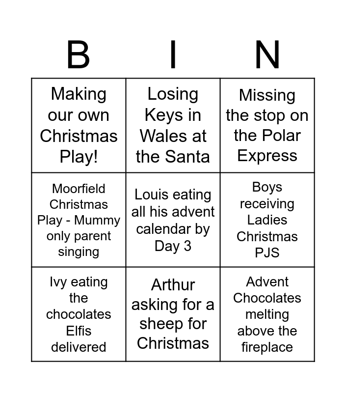 This bingo card has a free space and 8 words: Boys receiving Ladies Christmas PJS, Missing the stop on the Polar Express, Losing Keys in Wales at the Santa, Ivy eating the chocolates Elfis delivered, Making our own Christmas Play!, Advent Chocolates melting above the fireplace, Moorfield Christmas Play - Mummy only parent singing and Arthur asking for a sheep for Christmas.