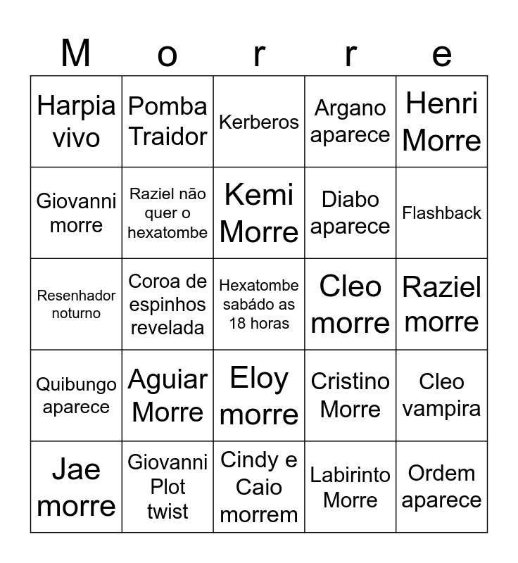 This bingo card has a free space and 24 words: Jae morre, Aguiar Morre, Kemi Morre, Labirinto Morre, Henri Morre, Harpia vivo, Pomba Traidor, Kerberos, Cleo morre, Raziel morre, Resenhador noturno, Raziel não quer o hexatombe, Cristino Morre, Cleo vampira, Giovanni morre, Giovanni Plot twist, Cindy e Caio morrem, Argano aparece, Flashback, Quibungo aparece, Coroa de espinhos revelada, Eloy morre, Diabo aparece and Ordem aparece.