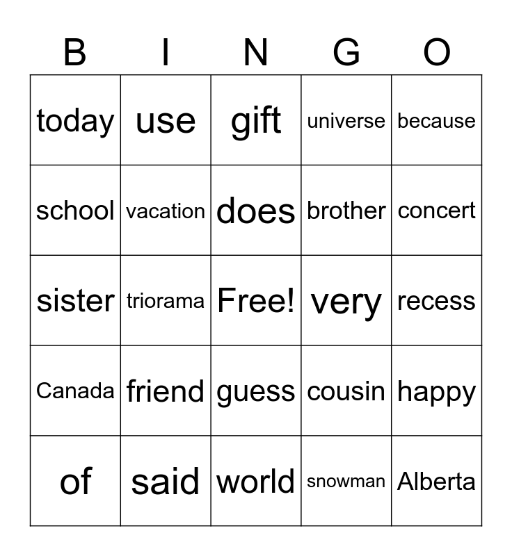 This bingo card has a free space and 24 words: friend, said, does, of, because, today, school, use, very, guess, brother, sister, cousin, happy, vacation, snowman, recess, gift, concert, triorama, Alberta, Canada, universe and world.