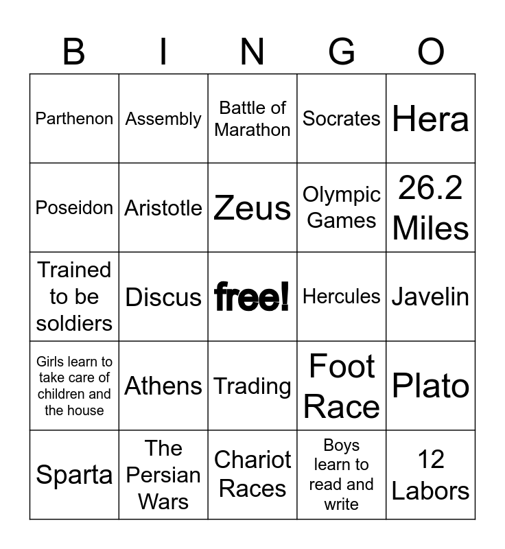 This bingo card has a free space and 24 words: Athens, The Persian Wars, Zeus, Sparta, Hera, Parthenon, Poseidon, Assembly, Hercules, Trading, Olympic Games, Trained to be soldiers, Foot Race, Plato, Aristotle, Boys learn to read and write, Javelin, Battle of Marathon, 26.2 Miles, Discus, 12 Labors, Girls learn to take care of children and the house, Socrates and Chariot Races.