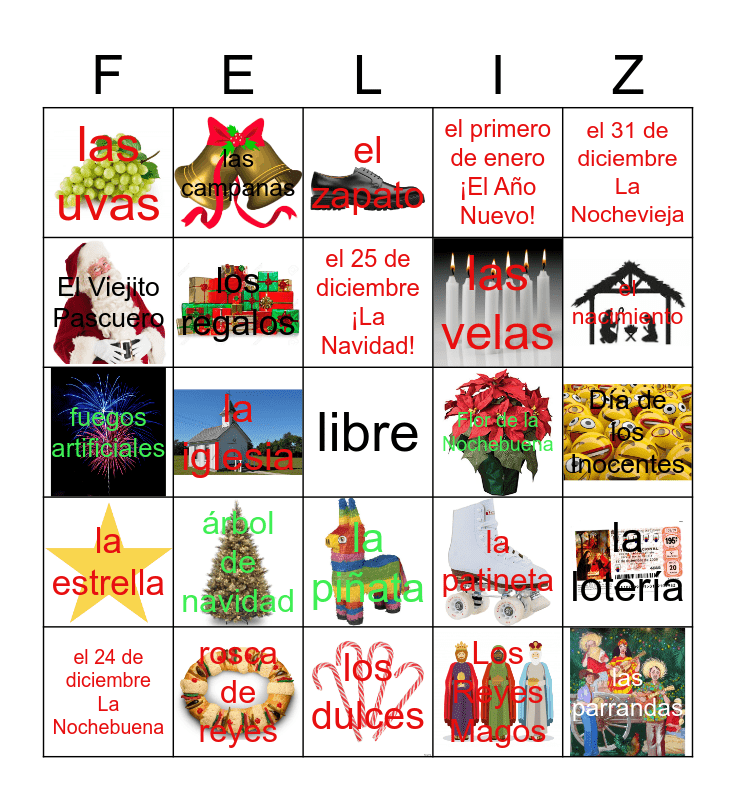 This bingo card has 20 images, a free space and 24 words: árbol de navidad, rosca de reyes, el 25 de diciembre ¡La Navidad!, el 24 de diciembre La Nochebuena, el 31 de diciembre La Nochevieja, las uvas, El Viejito Pascuero, las campanas, Flor de la Nochebuena, la piñata, las velas, fuegos artificiales, la patineta, la lotería, los regalos, Los Reyes Magos, Día de los Inocentes, el zapato, el nacimiento, la iglesia, las parrandas, la estrella, el primero de enero ¡El Año Nuevo! and los dulces.