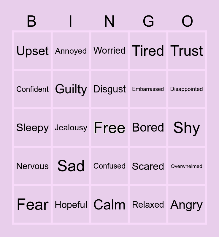 This bingo card has a free space and 26 words: Happy, Sad, Calm, Relaxed, Disappointed, Upset, Annoyed, Worried, Embarrassed, Overwhelmed, Sleepy, Jealousy, Scared, Angry, Nervous, Joy, Disgust, Bored, Trust, Fear, Guilty, Confused, Tired, Shy, Confident and Hopeful.