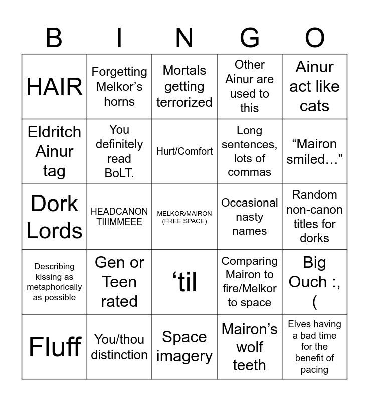 This bingo card has a free space and 24 words: Gen or Teen rated, You/thou distinction, Hurt/Comfort, Fluff, Ainur act like cats, HAIR, Eldritch Ainur tag, Forgetting Melkor’s horns, Occasional nasty names, ‘til, Long sentences, lots of commas, Dork Lords, Comparing Mairon to fire/Melkor to space, Big Ouch :,(, You definitely read BoLT., Mairon’s wolf teeth, Random non-canon titles for dorks, Mortals getting terrorized, “Mairon smiled…”, HEADCANON TIIIMMEEE, Elves having a bad time for the benefit of pacing, Describing kissing as metaphorically as possible, Other Ainur are used to this and Space imagery.