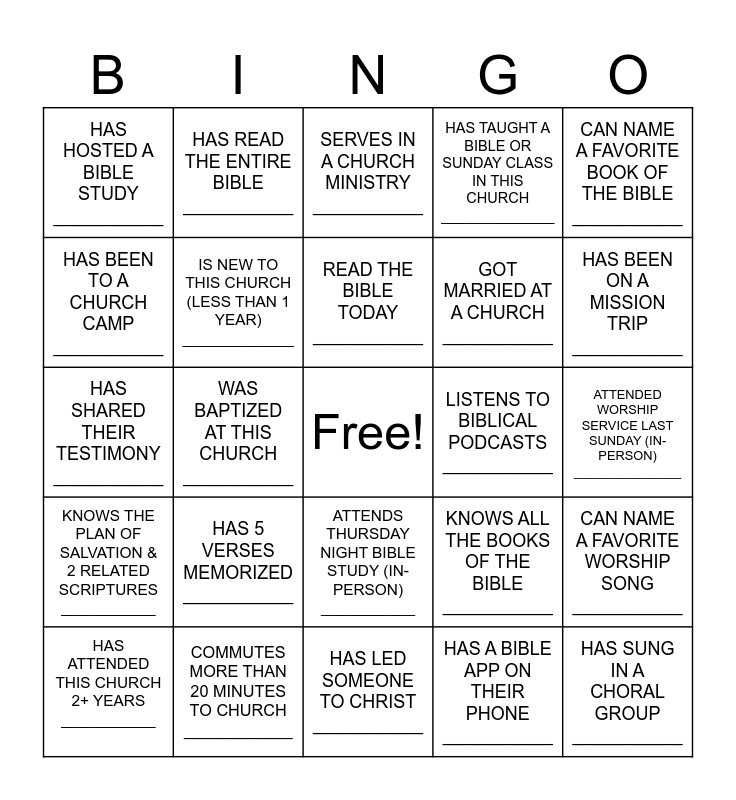 This bingo card has a free space and 24 words: HAS 5 VERSES MEMORIZED ___________, COMMUTES MORE THAN 20 MINUTES TO CHURCH ____________, READ THE BIBLE TODAY ___________, HAS ATTENDED THIS CHURCH 2+ YEARS ___________, CAN NAME A FAVORITE BOOK OF THE BIBLE ___________, HAS HOSTED A BIBLE STUDY ___________, HAS BEEN TO A CHURCH CAMP ___________, HAS READ THE ENTIRE BIBLE ___________, LISTENS TO BIBLICAL PODCASTS ___________, ATTENDS THURSDAY NIGHT BIBLE STUDY (IN-PERSON) ___________, GOT MARRIED AT A CHURCH ___________, HAS SHARED THEIR TESTIMONY ___________, KNOWS ALL THE BOOKS OF THE BIBLE ___________, CAN NAME A FAVORITE WORSHIP SONG ___________, IS NEW TO THIS CHURCH (LESS THAN 1 YEAR) _____________, HAS A BIBLE APP ON THEIR PHONE ___________, ATTENDED WORSHIP SERVICE LAST SUNDAY (IN-PERSON) _______________, SERVES IN A CHURCH MINISTRY ___________, HAS BEEN ON A MISSION TRIP ___________, WAS BAPTIZED AT THIS CHURCH ___________, HAS SUNG IN A CHORAL GROUP ___________, KNOWS THE PLAN OF SALVATION & 2 RELATED SCRIPTURES ___________, HAS TAUGHT A BIBLE OR SUNDAY CLASS IN THIS CHURCH ______________ and HAS LED SOMEONE TO CHRIST ___________.