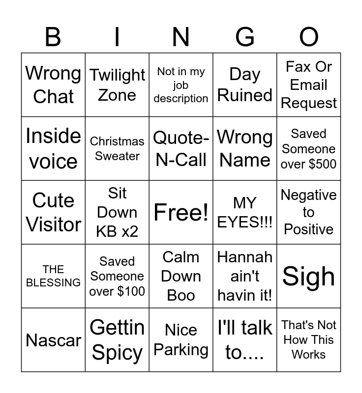 This bingo card has a free space and 80 words: personality much?, Sneeze attack!, Not in my job description, I'm closing like NOW!, Why you call?! It's almost 4:30!, Oh, you lyin, I didn't need that ear drum..., Ugh! Occupied, Nap Time!, It's time stamped, Yawn War, Never-ending Story, Day Ruined, Wrong Chat, Restarting!, Inside voice, Made Someone's day, Saved Someone over $100, Turned A Frown Upside Down, Negative to Positive, Dealer ID Card-Do it!, Fax Or Email Request, Cute Visitor, Quote-N-Call, Christmas Sweater, Christmas Shirt, Christmas Hat, Weather, Customer Compliment, Triggered, Saved Someone over $500, That's What She Said, Nice Parking, Flyin High, Nascar, MY EYES!!!, Personal Space, Vroom Vroom, Boyfriends, That's Not How This Works, No Thanks!, Struggle Bus, What's that smell?, Welcome To Elmira, WHAT IS YOUR NAME??, Twilight Zone, Wait to be greeted, Wee Woo, I need a form..., Over sharing isn't caring, Sigh, Sit Down KB x2, Hannah ain't havin it!, "Insurance"(ಠ_ಠ), Left The Conversation, You People, Random Noise, Cool ride bro, No Market, Calm Down Boo, Wrong Name, I really CAN help you, Bye Bye, Frequent Flyer, Sit Down KB, Interrupting Cow, Homegirl Mess-up, Where's the Febreze?, Mute Button, I said to myself, THE BLESSING, Gettin Spicy, There's a building here, Accident/almost accident out front, I'll have my own good day, IDK why my ins is so high, I'll talk to...., Can't Math, Rescue Me and Tasty Treat.