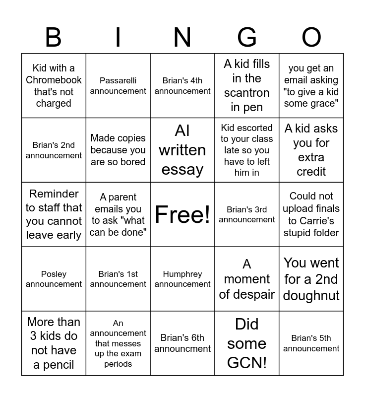 This bingo card has a free space and 24 words: Brian's 1st announcement, An announcement that messes up the exam periods, AI written essay, More than 3 kids do not have a pencil, you get an email asking "to give a kid some grace", Kid with a Chromebook that's not charged, Brian's 2nd announcement, Passarelli announcement, Brian's 3rd announcement, Humphrey announcement, Kid escorted to your class late so you have to left him in, Reminder to staff that you cannot leave early, A moment of despair, You went for a 2nd doughnut, Made copies because you are so bored, Did some GCN!, Could not upload finals to Carrie's stupid folder, Brian's 4th announcement, A kid asks you for extra credit, A parent emails you to ask "what can be done", Brian's 5th announcement, Posley announcement, A kid fills in the scantron in pen and Brian's 6th announcment.