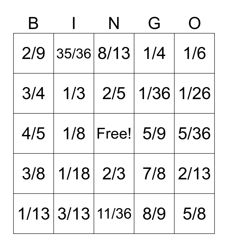 This bingo card has a free space and 35 words: 0, 1, 1/2, 1/3, 2/3, 1/4, 3/4, 1/5, 2/5, 3/5, 4/5, 1/6, 5/6, 1/9, 2/9, 5/9, 8/9, 1/8, 3/8, 5/8, 7/8, 1/13, 2/13, 3/13, 8/13, 1/26, 3/26, 2 /26, 1/36, 5/36, 5/18, 11/36, 1/18, 35/36 and 3/10.